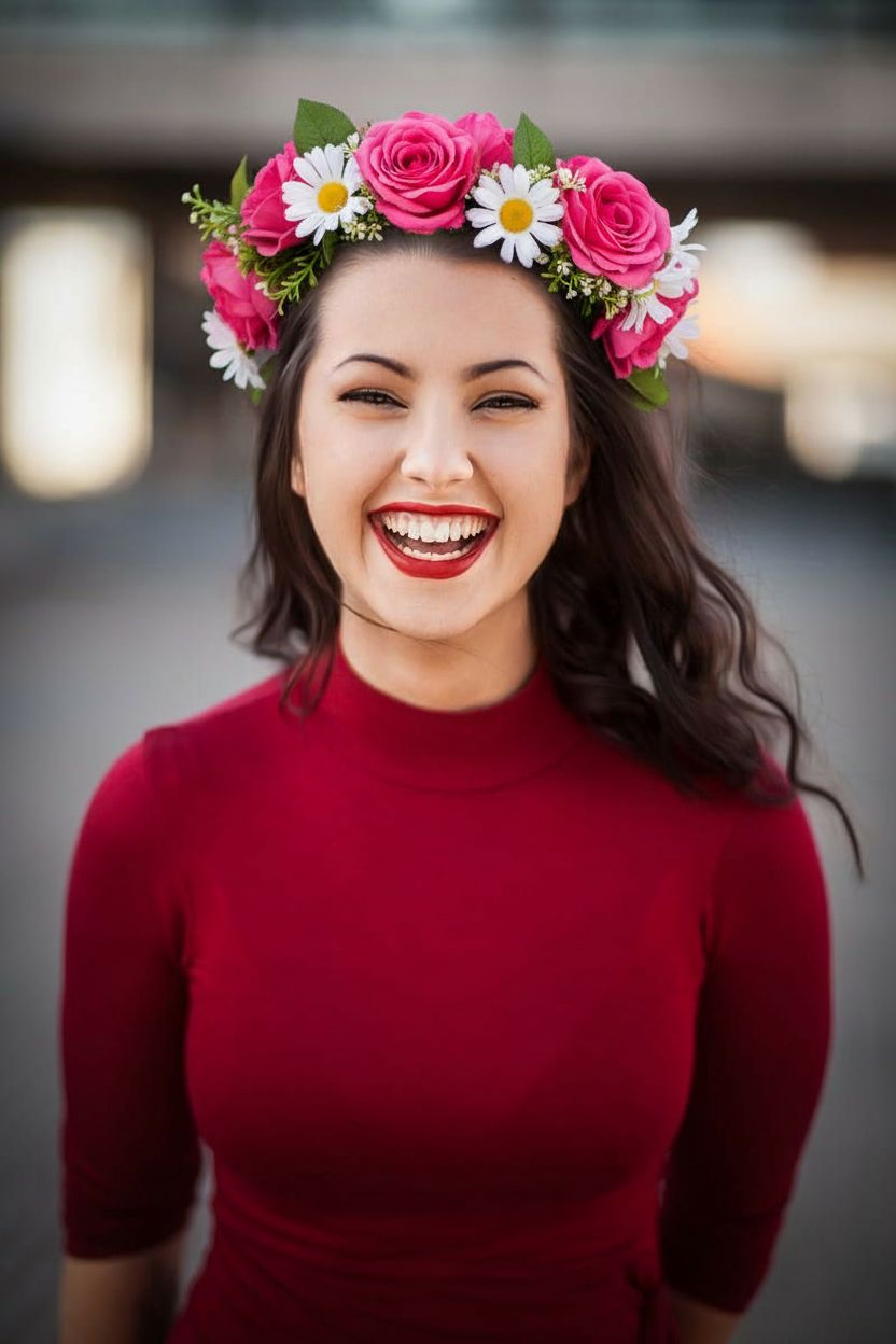 Crown your avatar with a beautiful wreath of roses, daisies, and fresh green leaves. The floral decoration blends naturally with your hair and lighting, creating a romantic, garden-fresh portrait with timeless appeal. **Prompt used:** Add a beautiful floral crown wreath on her head with pink roses, white daisies and green leaves, natural and lifelike flowers, same face and expression preserved