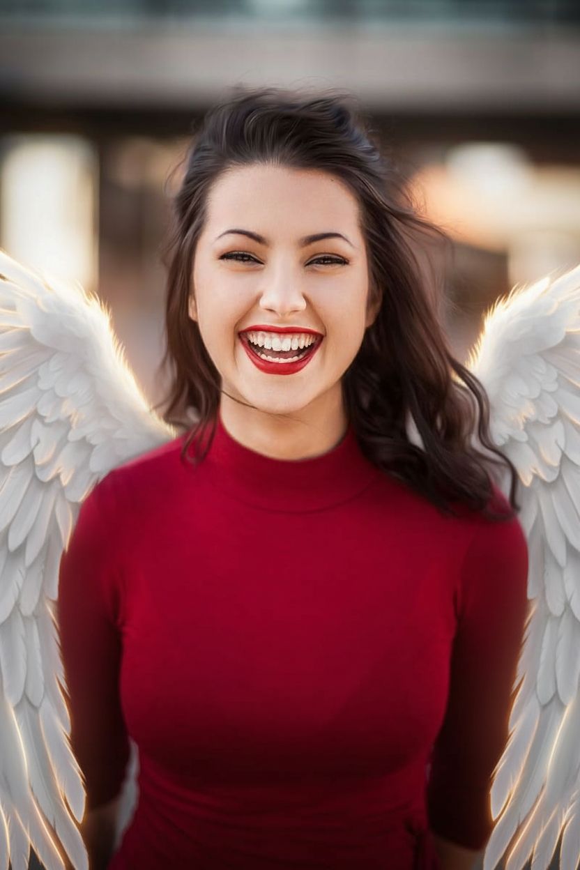 Unfurl magnificent white feathered angel wings behind your avatar. The wings spread gracefully with soft golden-lit edges, creating a powerful yet elegant celestial portrait — ideal for fantasy role-play or creative profiles. **Prompt used:** Add large white feathered angel wings behind her, wings spread gracefully on both sides, soft feathered texture with golden light edges, same face and pose preserved